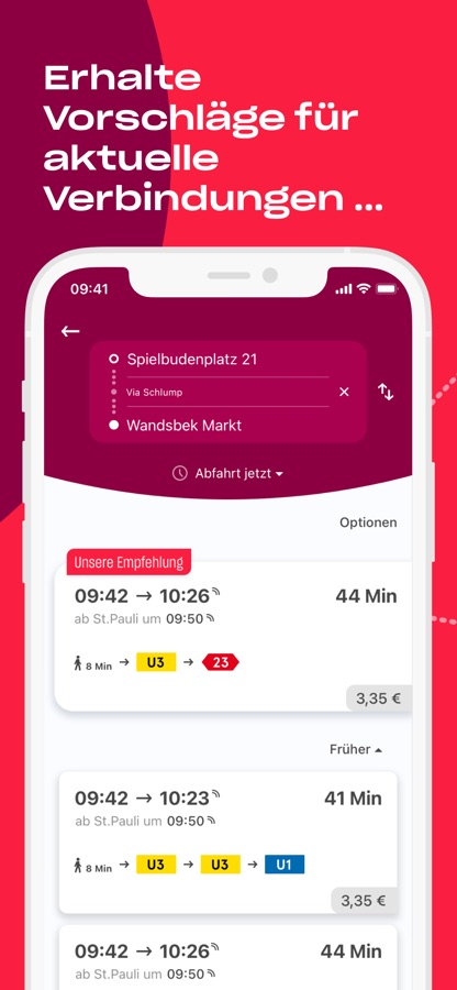 Finde immer die beste Route für Bus, U-Bahn, S-Bahn, Regionalbahn und Fähre. Der intelligente hvv Routenplaner ist dein Navi für den Hamburger ÖPNV und zeigt dir alle Reiseinformationen für deine Strecke in Echtzeit an. Zusätzlich kannst du deiner Route einen weiteren Zwischenstopp hinzufügen. Hat dein Bus oder die Bahn Verspätung? Oder ist eine andere Route schneller als der Zug? Mit dem hvv Routenplaner hast du stets die aktuelle Fahrplanauskunft zur Hand.