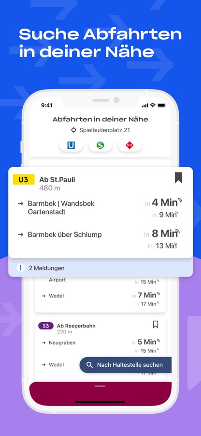 Du weißt wohin? Wir zeigen dir wann! Die hvv App zeigt dir die Abfahrten aller Linien für Haltestellen in deiner Nähe an. Wische dazu den Startbildschirm nach unten und informiere dich zu den aktuellen Abfahrten. So siehst du auf einen Blick, wann du einsteigen musst und sparst dir die Verbindungssuche. So behältst du immer den Überblick im ÖPNV.