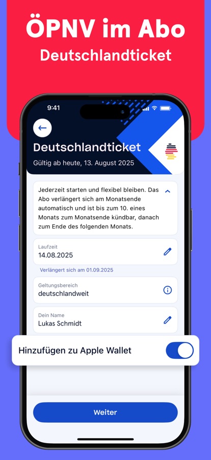 Ob Kurzstrecke, Einzelticket oder Tagesticket – die App schlägt dir automatisch das passende Ticket für deine Route vor. Beim Kauf sparst du 7 % auf die meisten Tickets und bezahlst sicher mit PayPal, SEPA oder Kreditkarte. Dein Ticket ist sofort in der App verfügbar und kann zusätzlich in deine Wallet geladen werden.