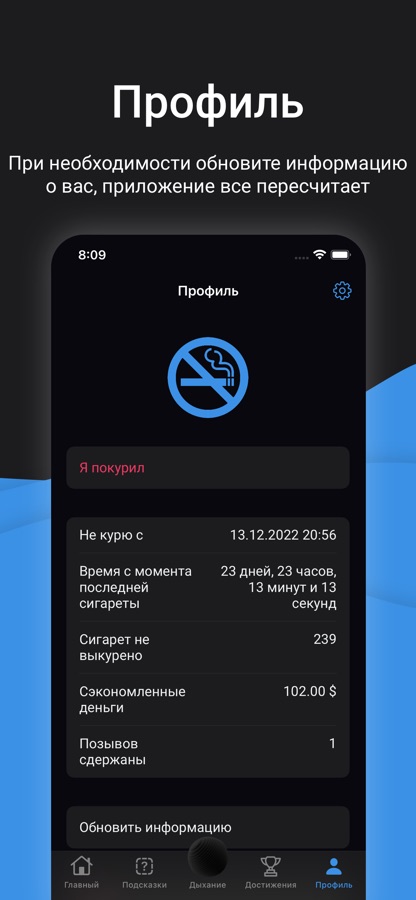 Это приложение уже помогло тысячам пользователей избавиться от вредной привычки и сделать свою жизнь чуточку лучше. И если вы действительно хотите поставить точку на курении, то у вас большие добиться успеха вместе с этим приложением.