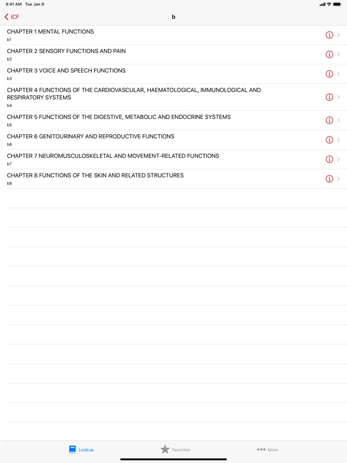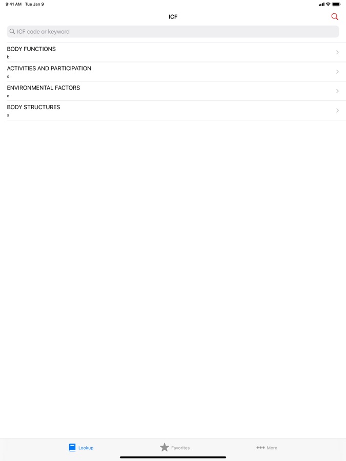Это приложение делает все официальные коды МКФ ВОЗ доступными в автономной базе данных. Нет рекламы, никаких разрешений не требуется.