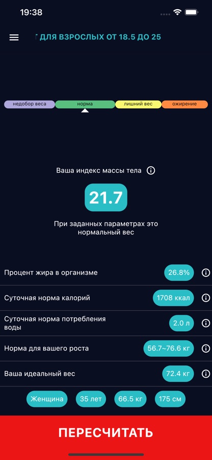 нормальный вес для вашего роста и возраста, индекс массы тела, процент жира в организме, дневная калорийность и потребление воды.