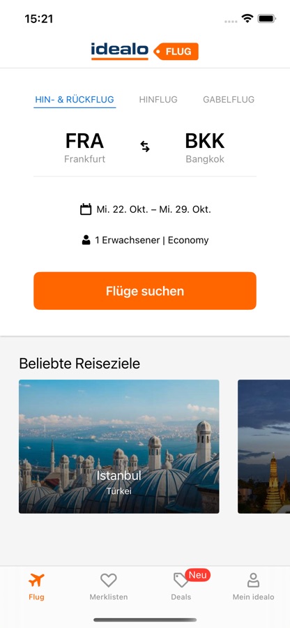 Günstig fliegen mit der Flug-App von idealo! Die App vergleicht in Sekunden Flug-Preisangebote zahlreicher Partner-Reiseportale und Airlines. So findest Du schnell und unkompliziert günstige Flüge.
