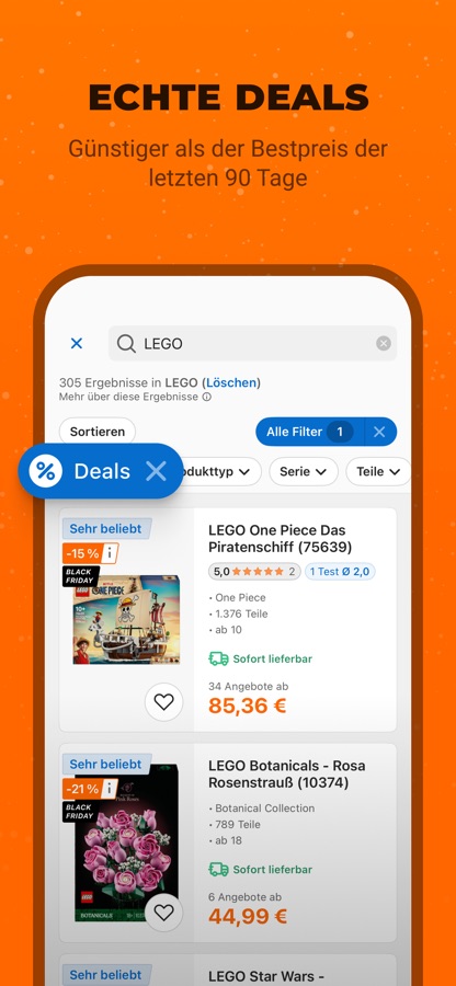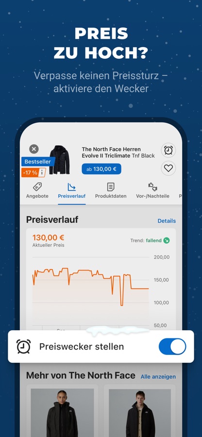 Schau’ dir an, wie sich der Preis für dein Wunschprodukt entwickelt – steigt er an oder ist das Produkt gerade so günstig wie lange nicht mehr? Mit dem Preisverlauf bekommst du ein Gefühl für wahre Schnäppchen und kannst beim Einkaufen Geld sparen.