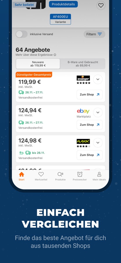 Mit der idealo Shopping-App kannst du rund um die Uhr die besten Angebote für deine Lieblingsprodukte vergleichen und zum Schnäppchen-Preis online kaufen. Insgesamt kannst du mehr als 350 Millionen Angebote von über 50.000 Online-Shops vergleichen und Geld sparen — darunter Angebote von Amazon, eBay, Media Markt, Saturn und Zalando.