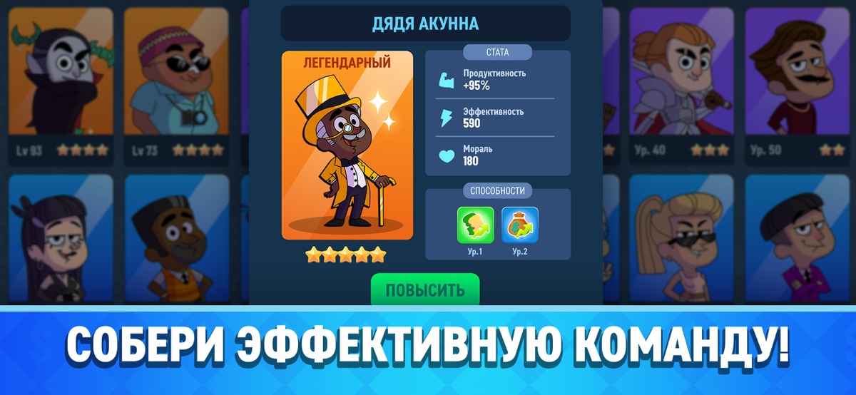 — Собирайте менеджеров и улучшайте их, чтобы увеличить штат и пройти проверки банка!