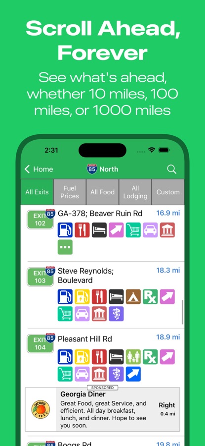 Need gas? iExit knows all the gas prices in the United States, and can tell you which station is cheapest at each exit. It also makes it easy to compare prices by the exits ahead, letting you know exactly where to exit to save the most. It works for Unleaded, Mid Grade, Premium, and Diesel.
