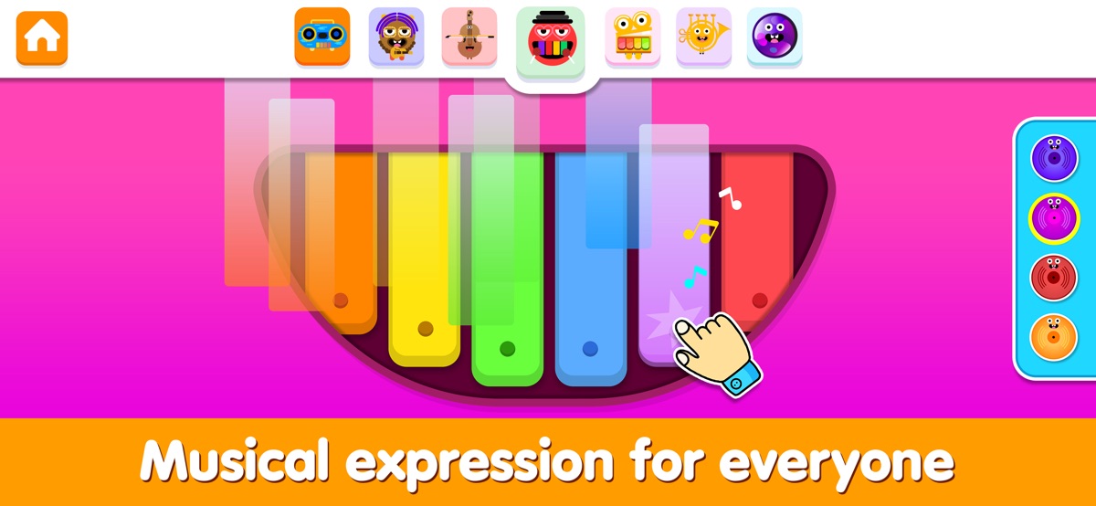 Изучение музыки – это увлекательное приключение! Играйте на ярких инструментах, таких как фортепиано, ксилофон, барабаны, саксофон, труба, флейта и электрогитара, используя пальцы на телефоне или планшете.