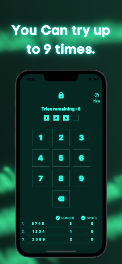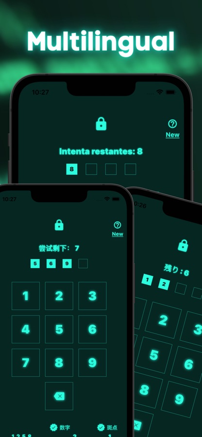 ■ Как играть1. Игрок входит в четырехзначный пароль. Если вы не можете разблокировать его, вы получите подсказку, были ли вы в правильном месте или нет. 3. Игрок угадывает пароль, ссылаясь на подсказку и снова входит в пас -код. Вы можете войти в пас -код до 9 раз. Игра должна разблокировать пароль в течение 9 раз. Не вводите один и тот же номер.