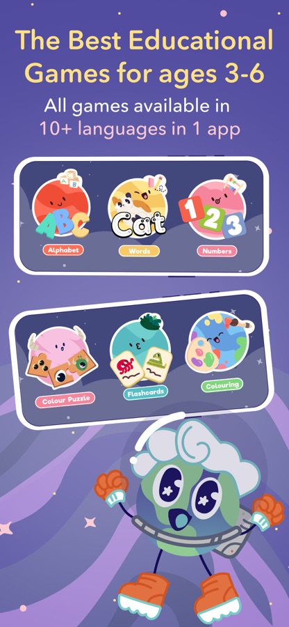 Vocabulary flashcards, ABC & alphabet games, Counting & math challenges, Preschool activities, and Coloring games for kids.