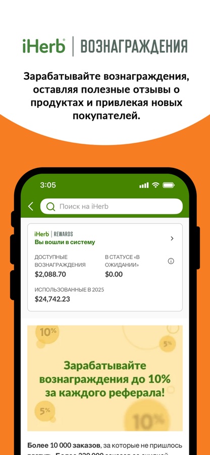Рассказывайте об акциях и скидках iHerb и зарабатывайте бонусы, которые можно потратить на покупки в нашем интернет-магазине или обналичить. Зарабатывайте ещё больше с еженедельными супервознаграждениями.