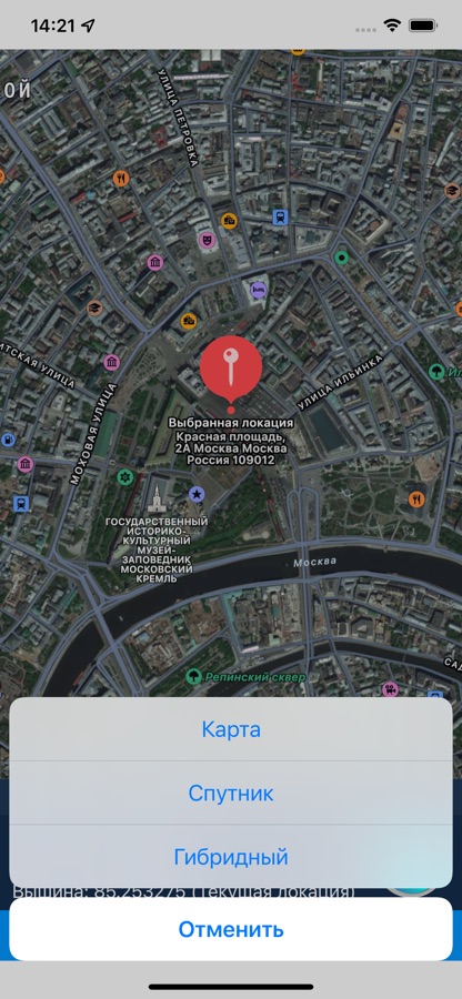 • Изменение типа карты при просмотре(обычный вид, вид со спутника)