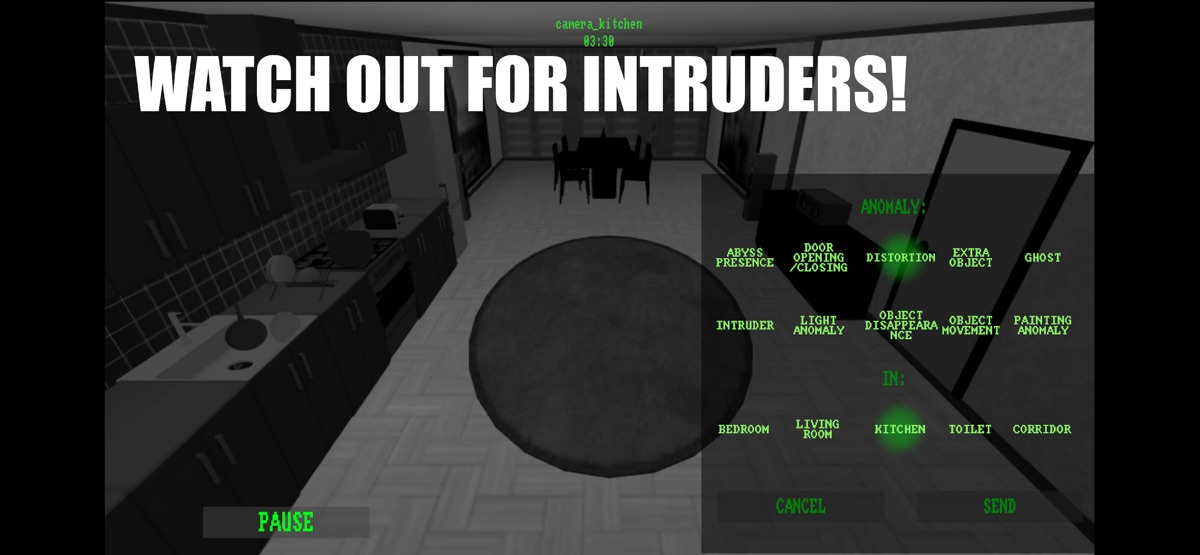 A horror game about monitoring live surveillance camera footage and spotting anomalies that range from furniture movement to otherworldly intruders. After spotting an anomaly you have to file a report describing the type and location of the anomaly. Some anomalies are easy to spot while others can be very difficult to detect. You will need sharp eyes and good memory to survive the entire night. Maybe you’ll even discover some secrets along the way!
