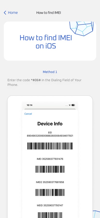 Curious about the app’s functionality? Download it and input the IMEI number or perform an IMEI lookup by scanning QR codes or barcodes. Let the IMEI Info Checker App manage and validate your device’s IMEI number.