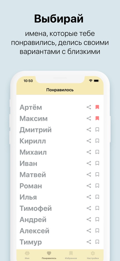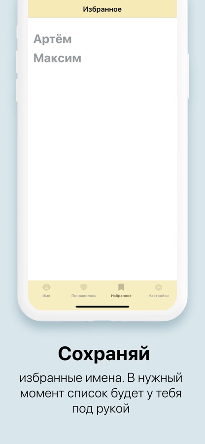 Листаем вправо – если имя нравится, влево – если имя не нравится, чтобы оно не встретилось снова. Понравившиеся имена сохраняются и всегда под рукой.