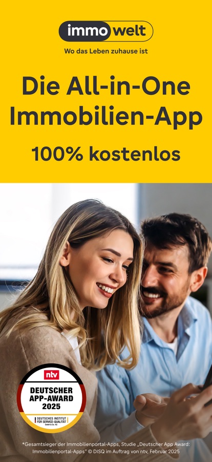 Vertraue dem Testsieger: Die immowelt App wurde 2025 vom Deutschen Institut für Service-Qualität und ntv als beste Immobilien-App ausgezeichnet.