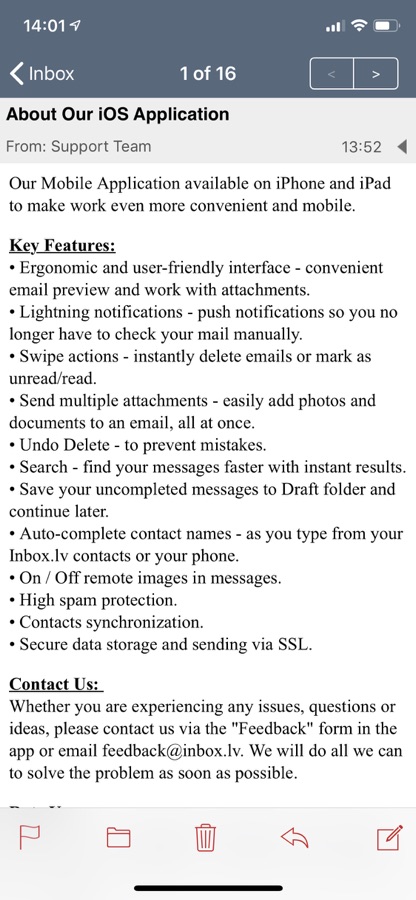 Если у вас возникли какие-либо проблемы, вопросы или идеи, пожалуйста, свяжитесь с нами через форму «Обратная связь» в приложении или по электронной почте feedback@inbox.lv. Мы сделаем все возможное, чтобы решить проблему как можно скорее.