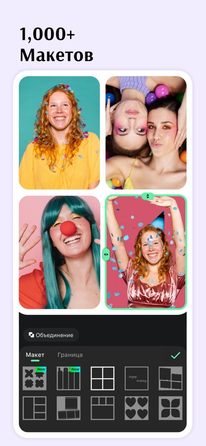 Создавайте коллажи из до 20 фото за секунды, используя тысячи стильных шаблонов. Настраивайте размеры, границы и фоны, чтобы каждый коллаж был уникальным.