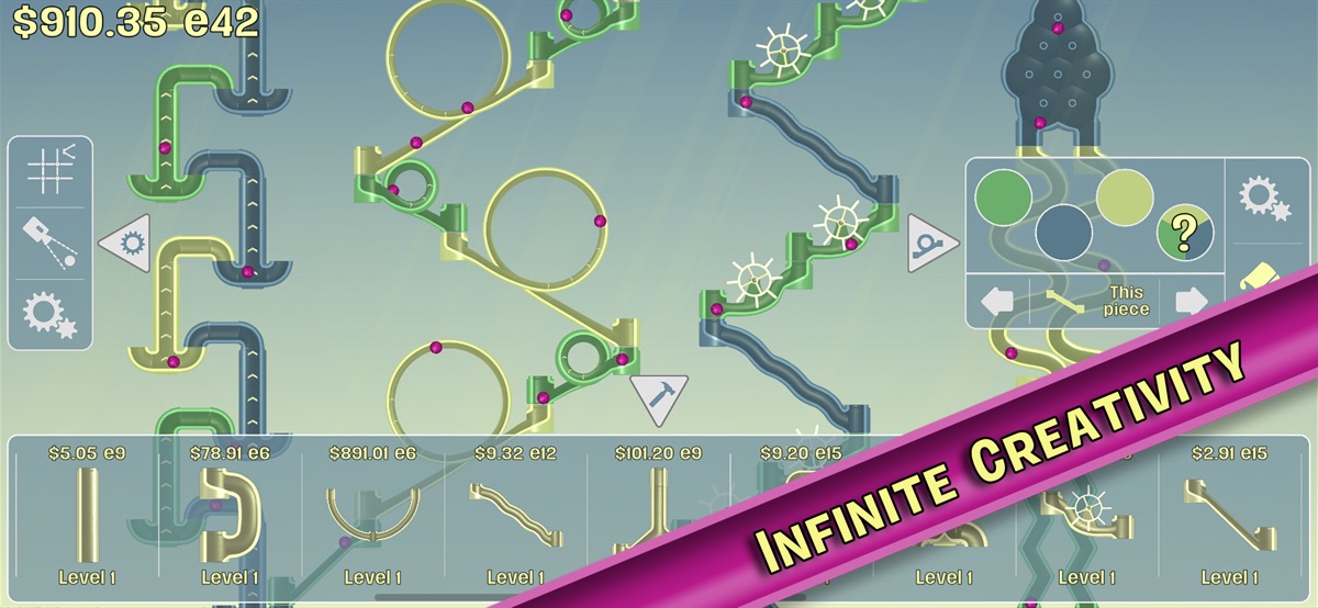 This free to play marble run construction kit with tycoon game trappings lets you build massive marble slide towers using over 30 unique pieces. Enjoy the ASMR rolling and clacking sounds of marbles on plastic. Get mesmerized by the realistic (and sometimes supernatural) physics of a never-ending stream of marbles. Start small, earn money, spend it on upgrades to earn more, build more slides, and create the marble slide world of your dreams!