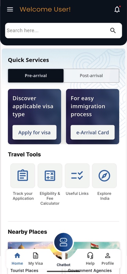 Single point of access for all visa related services of Government of India to facilitate Foreign Visitors intending to Visit India. The main objective of the app is to facilitate Visitors seeking Indian Visa abroad and obtaining visa related services within India while their stay. The app will ease out the Indian Visa related information dissemination to target users. App has been designed with the holistic view of facilitating Visitors at each touch point, from getting Indian Visa to exploring Indian Culture, Heritage, Business Prospects, Medical treatment, Education, emergency services and Yoga/Spirituality in India.