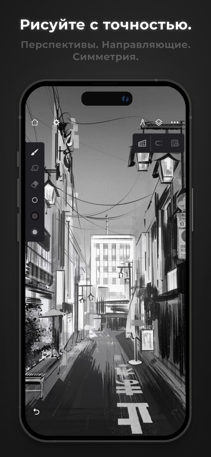 • Рисуйте трехмерные пейзажи городов с помощью пяти разных направляющих перспективы