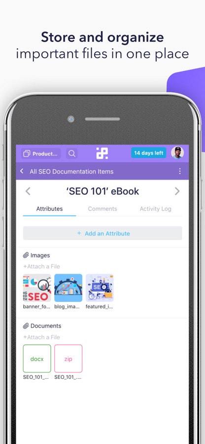 Infinity was built to help you organize any type of data. The mobile app makes sure to offer the same flexibility. Just like in our web version, you can build and shape your items with 15 custom attributes that will allow you to create to-do lists, CRM, databases, or anything else you need.
