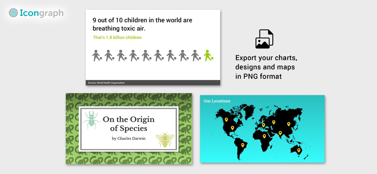 Use Icongraph’s design templates to make infographic charts, pin maps and graphic designs for your presentations, web visuals, social media posts and marketing campaigns.