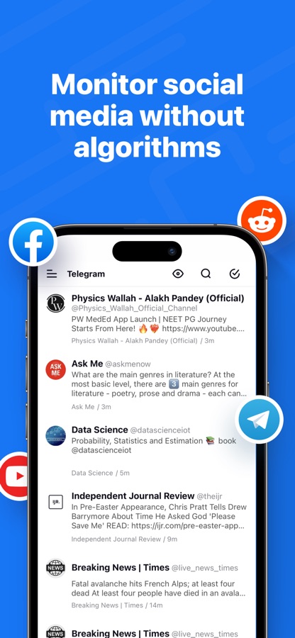 • Monitor Facebook pages, Reddit feeds, and Telegram channels