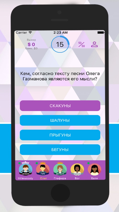 Твоя главная задача — ответить правильно на 15 вопросов и выиграть один миллион долларов. Но в битве за победу участвуют одновременно 5 игроков. Все отвечают на одни и те же вопросы. Кто-то быстро «вылетает» из игры, кто-то идет дальше и правильно отвечает на все более и более сложные вопросы. А ты сможешь стать миллионером? И сможешь ли быть лучшим среди четырех противников?