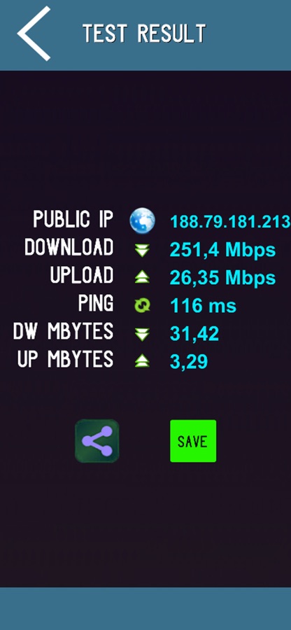 With this simple and free application you can measure the quality of your Wi-Fi connection or mobile data, simply touch a button. Measures download speed, upload speed and ping. It also shows your public IP and the data obtained in mega bits per second and in megabytes per second.