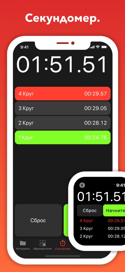 • Секундомер, который работает в альбомной и портретной ориентации, показывает лучшее и худшее время прохождения круга и синхронизируется с Apple Watch.