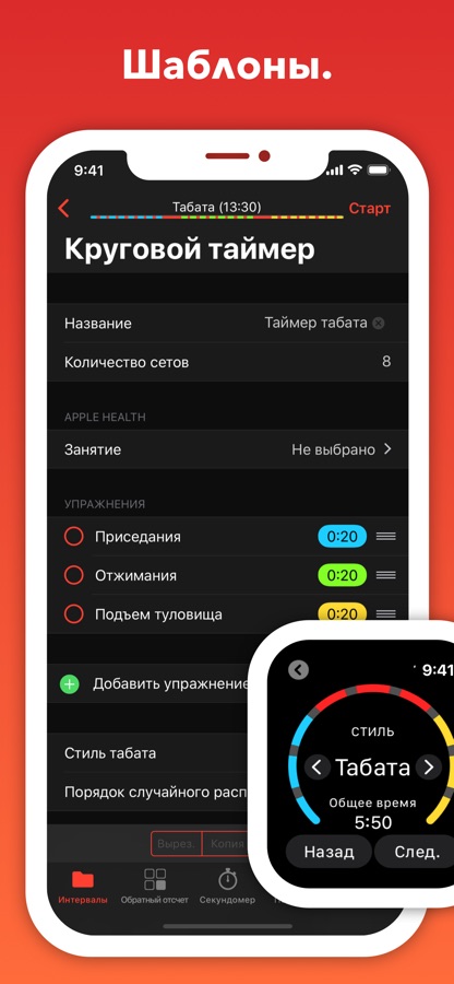 • Шаблоны для HIIT, Tabata и кольцевых тренировок. Пользовательский шаблон для создания каждого интервала. А также составной редактор, в котором вы можете объединить несколько интервальных таймеров в один.