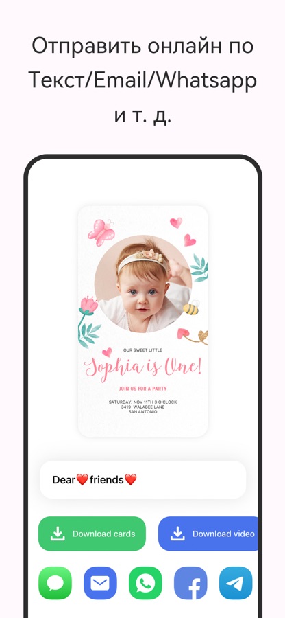 * Легко настройте свою карточку или приглашение и отправьте онлайн или загрузите дизайны или экспортируйте видео бесплатно!