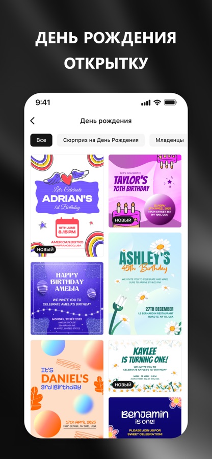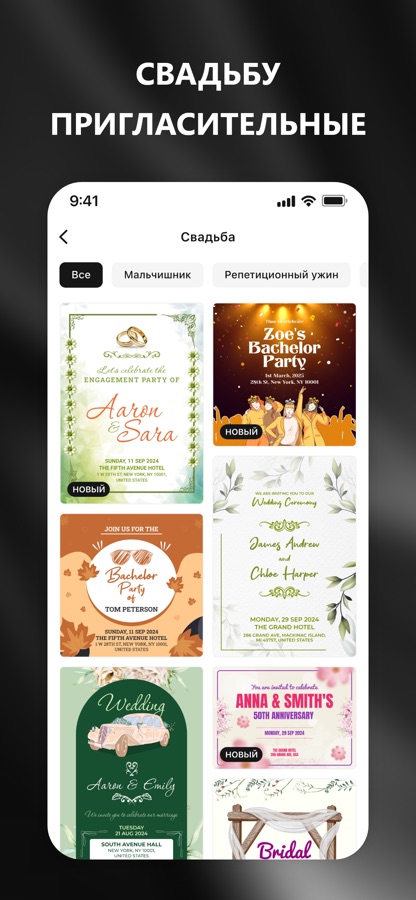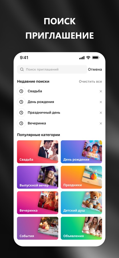 • Несколько категорий приглашений, таких как свадьба, праздник, вечеринка, день рождения и мероприятие.
