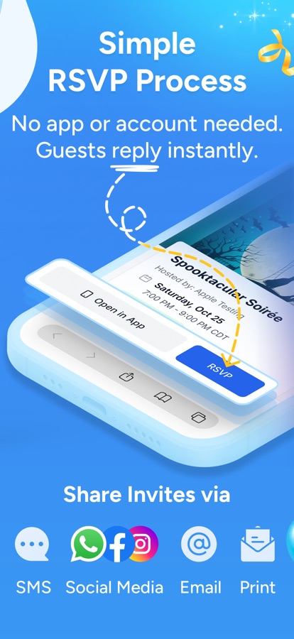After you create your invitation card with our birthday invitation maker, you can send invitations easily. The best part is that your guests don’t even need the mobile invites maker app to view their online invitations and send their party RSVP.