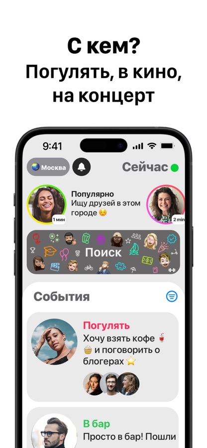 ПРОСТО: делаешь пост, например «Пошли гулять», «Кто со мной в кино?» или «Хочу в бар». Твое предложение увидят окружающие, проявят интерес и вы договариваетесь в чате о деталях.