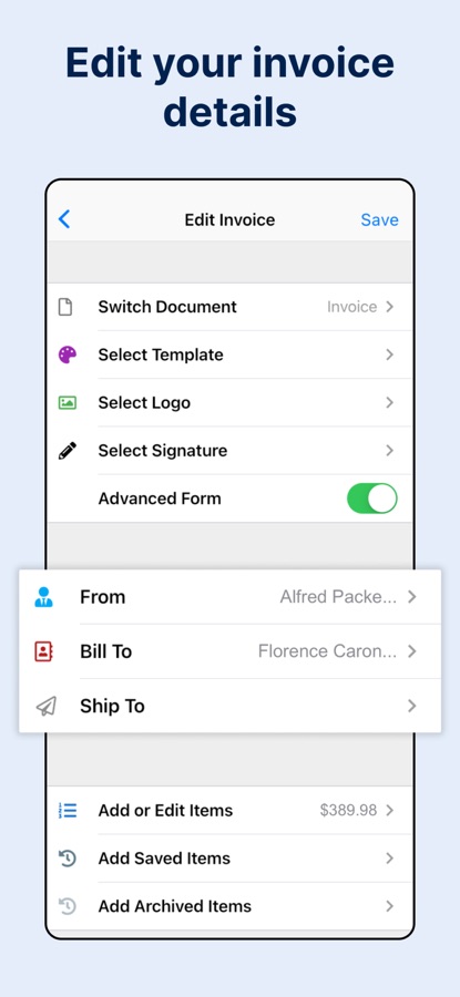 Create an invoice, estimate, quote, or receipt and email it as a PDF. Try our fast, secure and easy to use billing app for free. Choose from over 100 professional templates, add a logo and your signature. Get paid fast via your customer’s credit card or PayPal account. Download our user-friendly, quick & easy invoice maker for freelancers and small businesses.