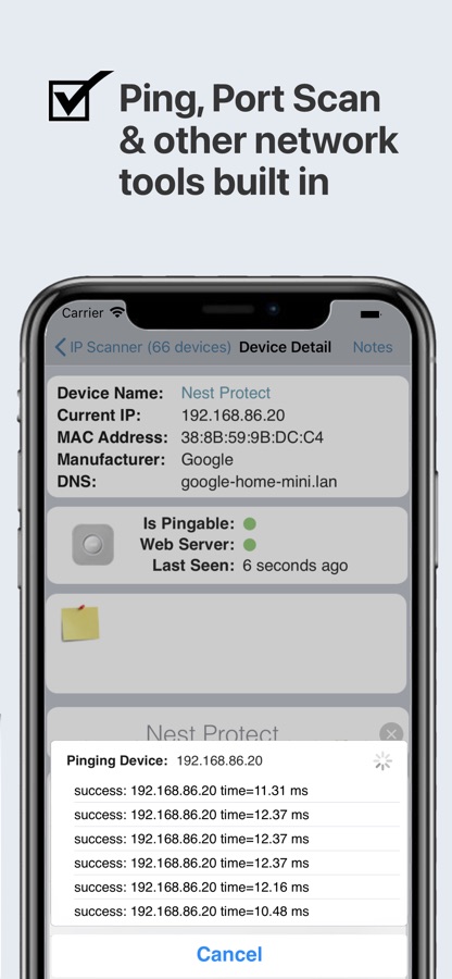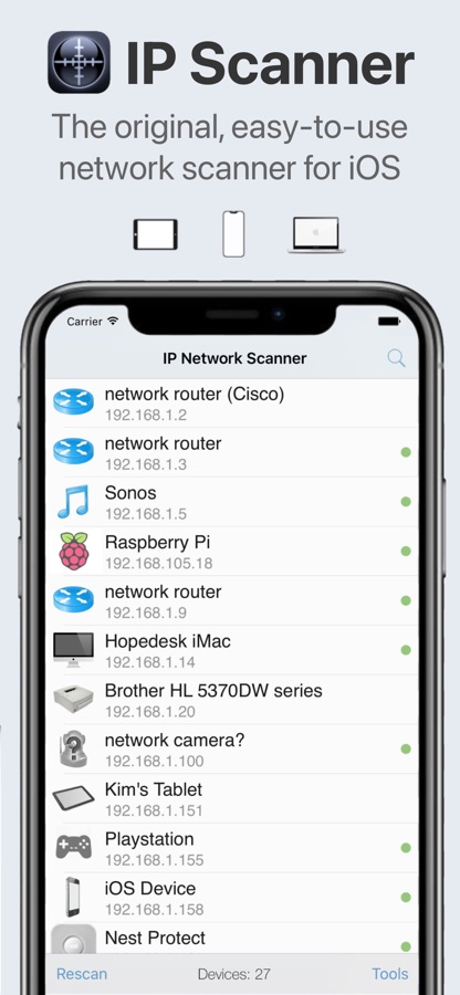 IP Scanner for iOS scans your local area network to determine the identity of all active machines and internet devices on the LAN. Powerful results, yet easy, quick and intuitive to use.