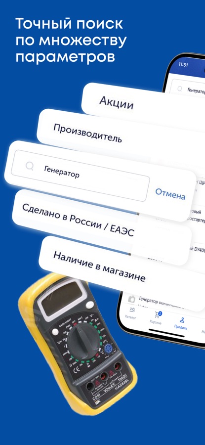 — Удобный подбор товара: сравнивайте товары, подбирайте аналоги, фильтруйте по характеристикам, ищите по штрихкоду.