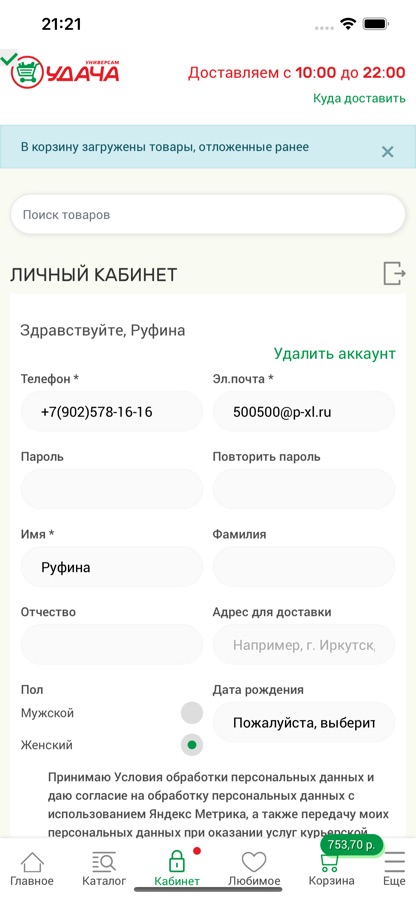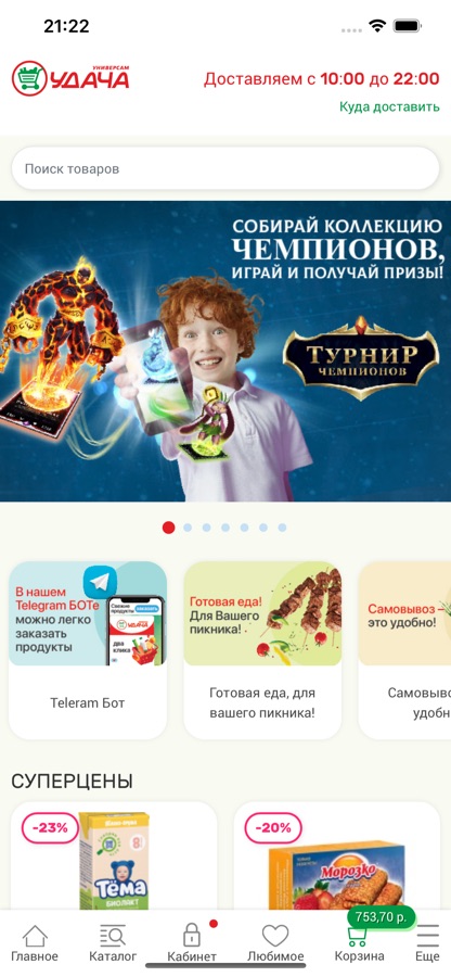 Мы доставляем только свежие и качественные продукты питания из ваших любимых супермаркетов — Удача и Экономия. Вы можете заказать мясные и молочные продукты, бакалею, свежие овощи и фрукты, кулинарию нашего собственного производства, хозяйственные товары и многое другое. Мы доставляем в кратчайший срок!