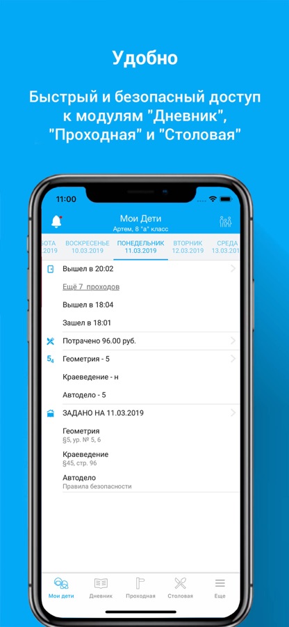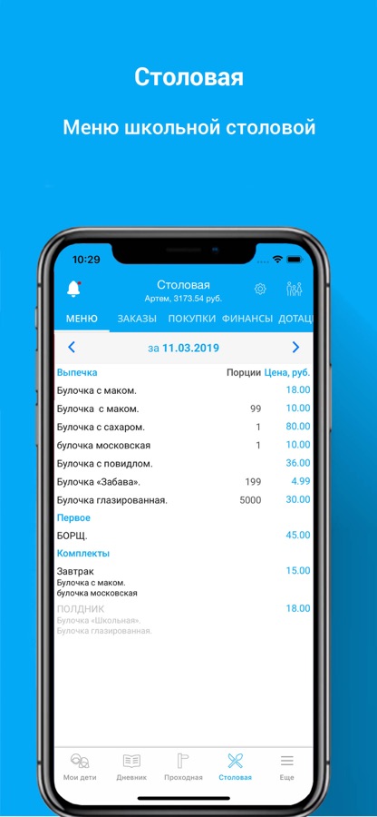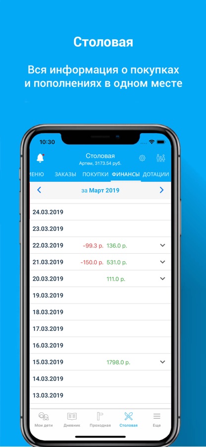 «Столовая» — пользователи получают информацию о школьной столовой: учёт льготного питания (бесплатное питание 1-4 классов) и его состав; меню, что приобретал ребенок в школьном буфете; контролировать остаток средств на карте ребенка; просматривать информацию о начислениях дотаций. Родители смогут переводить деньги между счетами своих детей. Дети могут создавать покупки с помощью мобильного приложения, аналогично терминалам самообслуживания и получать продукцию на точке выдачи в школьной столовой.