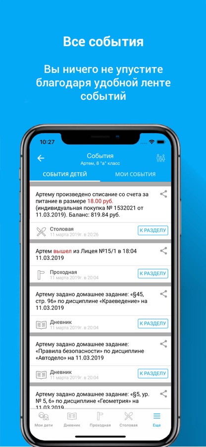 «Проходная» — родителей, в режиме реального времени, получают информацию о использовании ребенком Системы контроля и управления доступом в образовательном учреждении, каждый вход/выход ребенка записывается в архив событий, а на мобильное устройство родителя поступают push-уведомления.