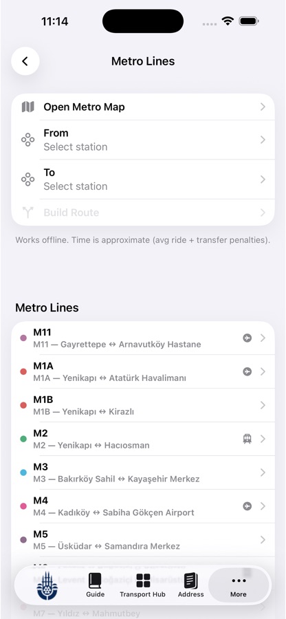 Интеграция с картой города: удобное переключение между схемой метро и картой города. Понимайте, как линии метро связаны с улицами и районами Стамбула — так проще планировать маршрут и исследовать город.