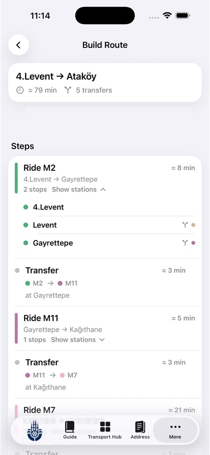 Мы понимаем, что у жителей и туристов разные потребности в общественном транспорте — и наше приложение учитывает обе. Для местных пользователей оно может быть удобным источником актуальной информации, помогая экономить время и упрощать ежедневные поездки. Для туристов приложение предлагает дружелюбный интерфейс и помогает ориентироваться в городе, чтобы вы могли получить максимум от визита в Стамбул.