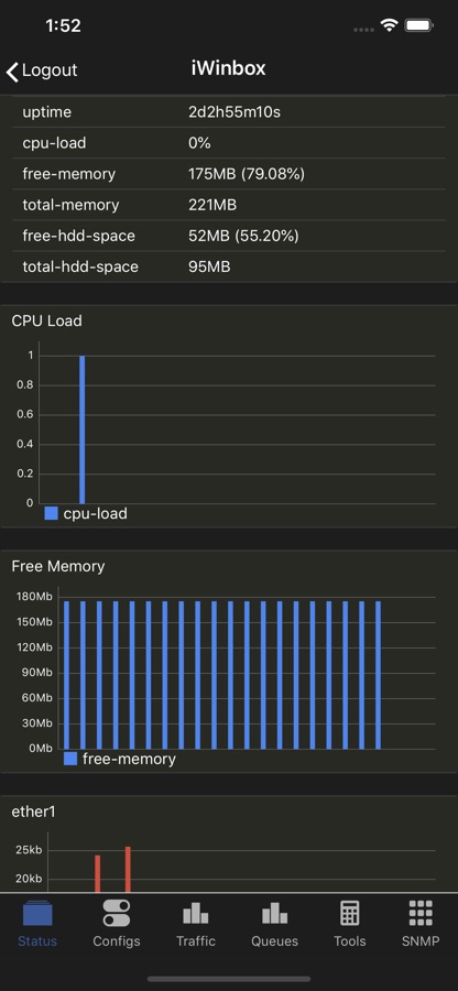 — Live chart for cpu load and free memory. Live ethernet traffic charts.
