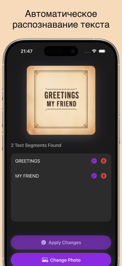 Мы делаем редактирование текста на любом изображении невероятно простым. Загрузите изображение, приложение автоматически обнаружит и отобразит текст, отредактируйте или удалите текст по своему усмотрению. Затем вы можете мгновенно сохранить или поделиться своей новой фотографией.