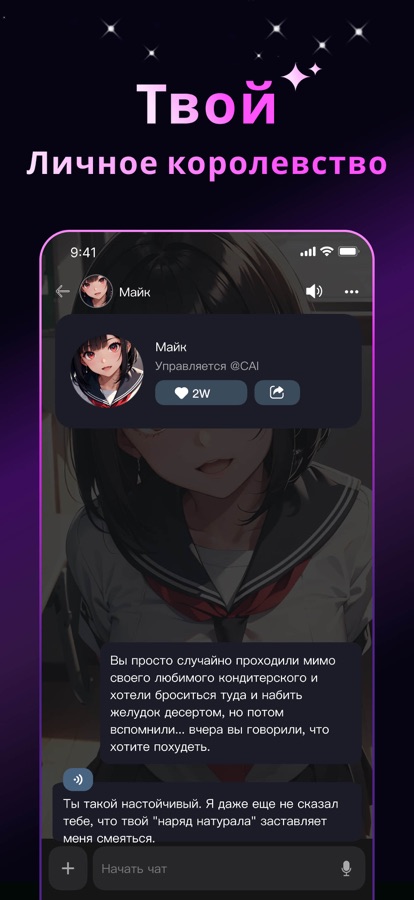 От утренней чашки чая до чистки зубов вечером, персонаж ИИ найдет разговоры, которые сделают ваш день. Являетесь ли вы болтуном, фанатом технологий или просто любителем посмеяться, здесь есть что-то для каждого. Наслаждайтесь бесконечным потоком ИИ, с которыми вам понравится общаться.