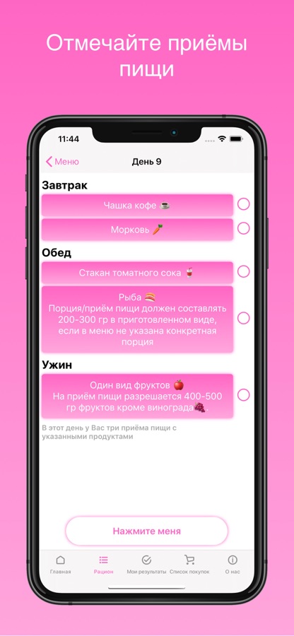 — Возможность отмечать съеденные продукты или приёмы пищи