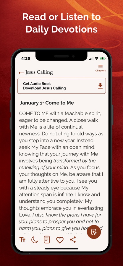 Jesus Calling is your yearlong guide to living a more peaceful life. The Jesus Calling App is the mobile version of the time-tested classic packed with digital and audio features that make this daily devotional more accessible than ever.