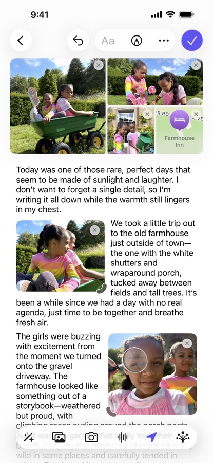 • Добавляйте фото, видео и геопозиции, чтобы проиллюстрировать свою историю. Настройте макет записи, легко размещая вложения прямо в тексте.